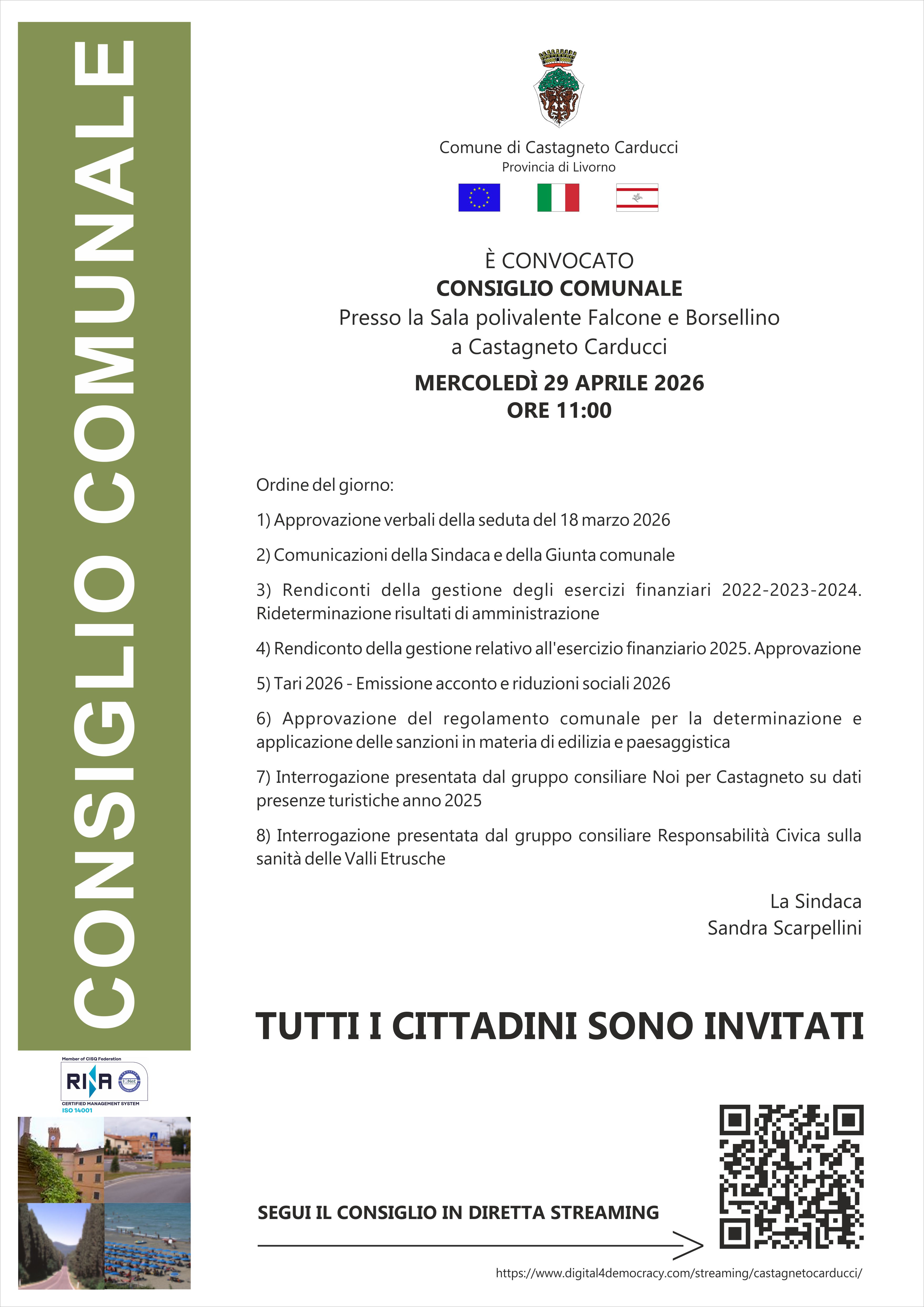 È convocato Consiglio Comunale presso la Sala Falcone e Borsellino a Castagneto Carducci per il giorno